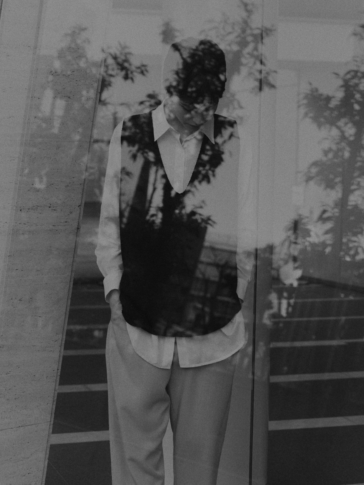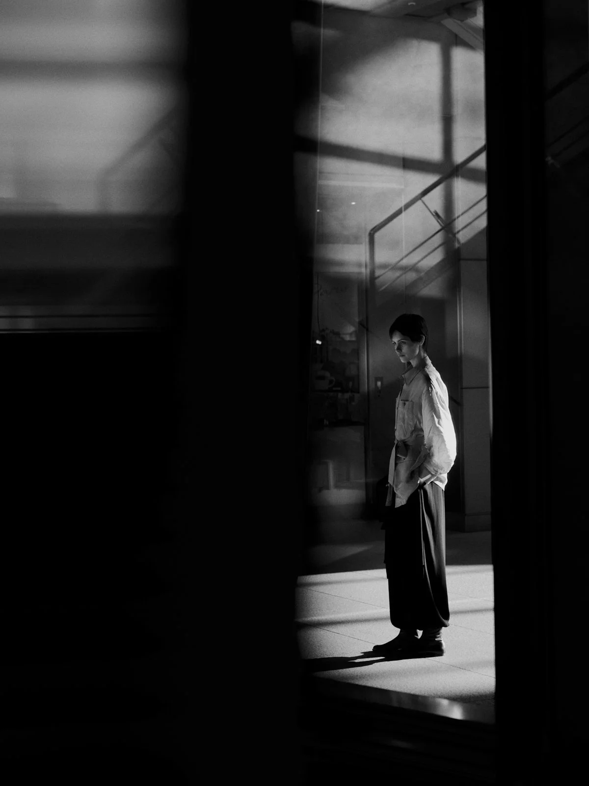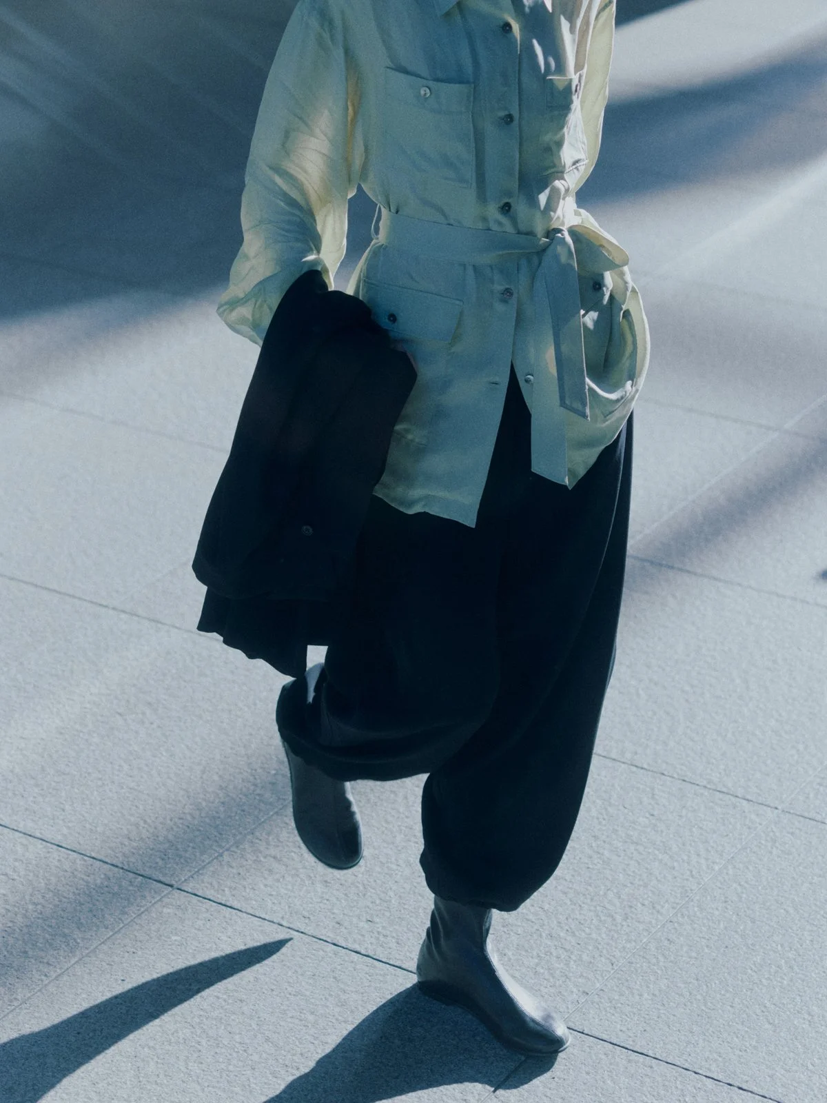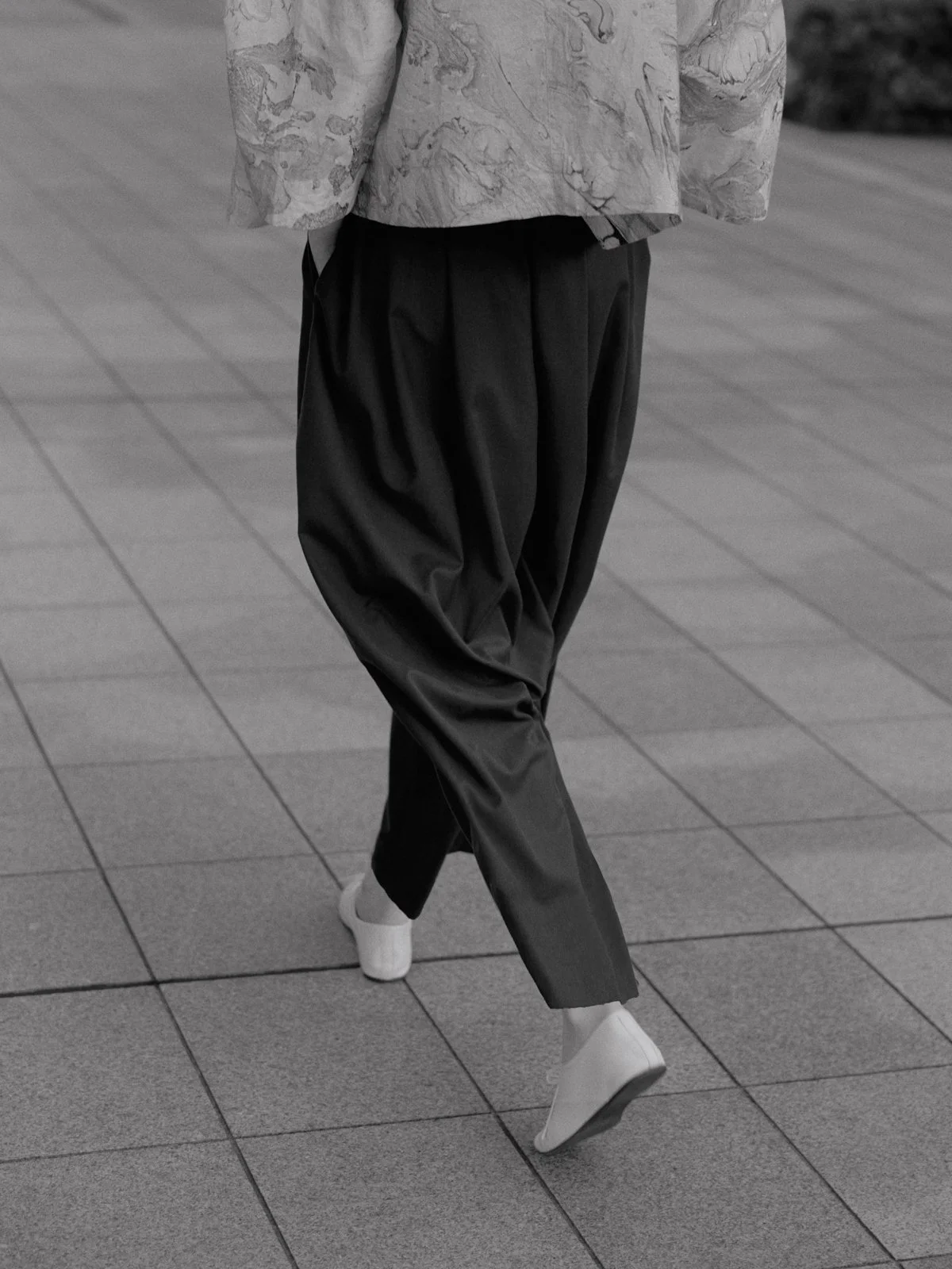 The lines created by the pants silhouette sway with movement,