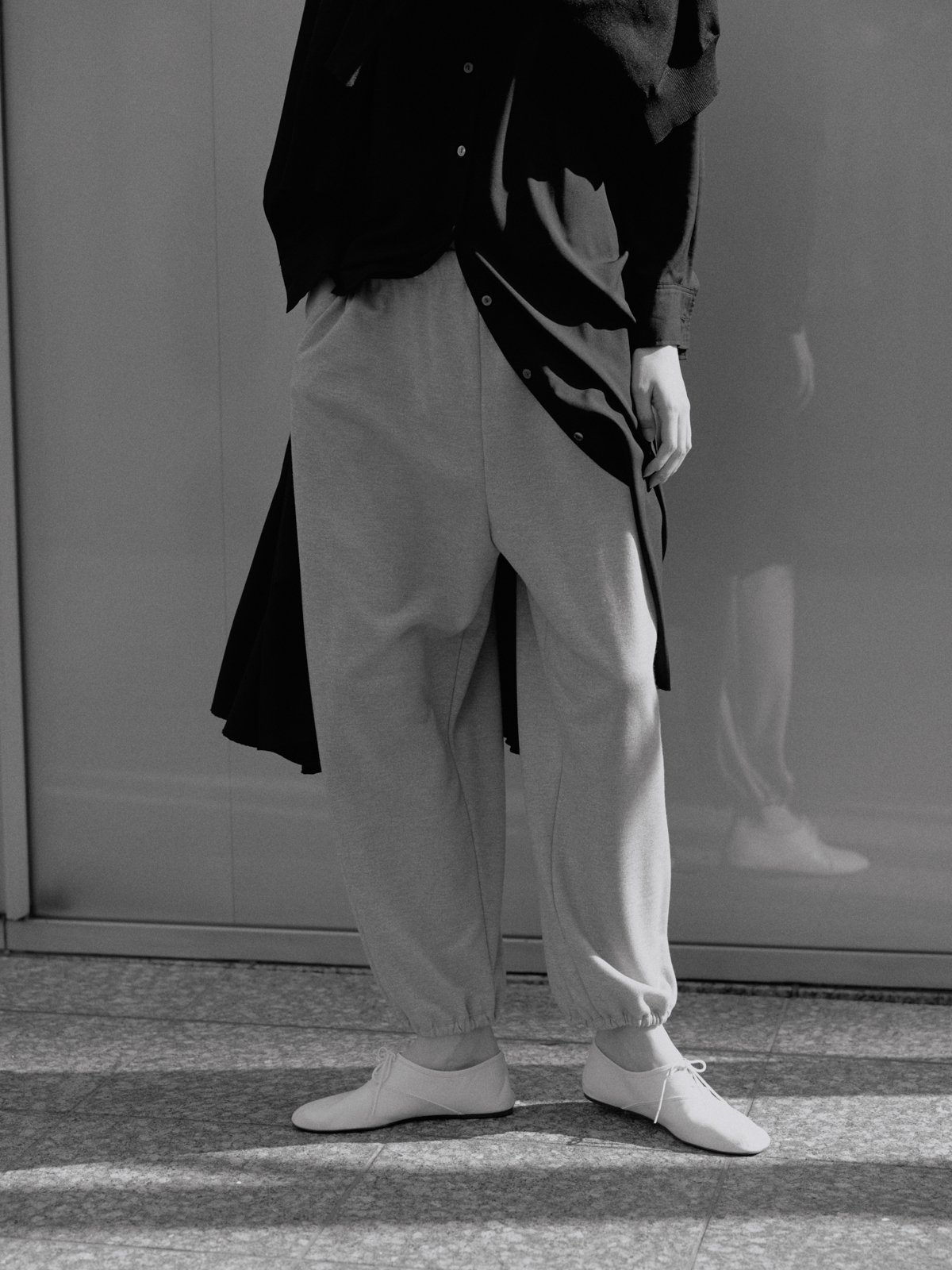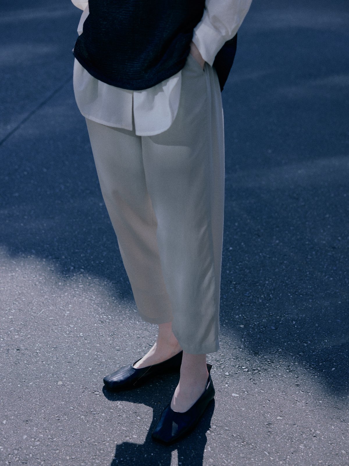 A soft texture and a clean, composed presence. Drawstring pants with a relaxed silhouette that brings out a vertical, graceful line. They create a sense of spaciousness, sketching a serene balance within a feeling of ease.